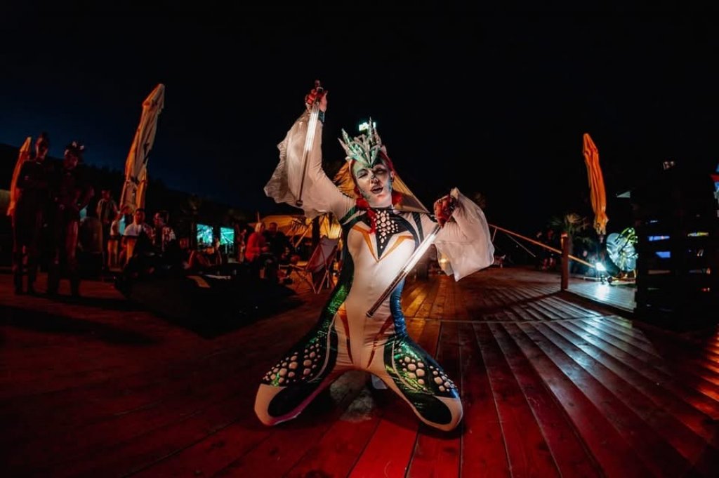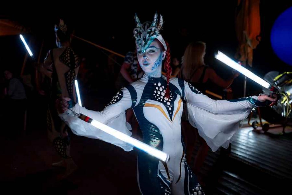 The tranquil Space Sphere was visited by Aliens with their light walking acts. The playful and curious extraterrestrial visitors interacted with people, explored the art installations around them and performed tricks with LED equipment. We displayed space themes and the Space Sphere logo in the artists' equipment.
