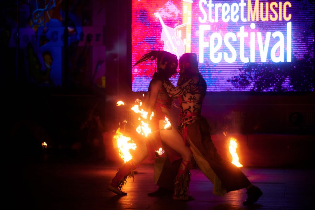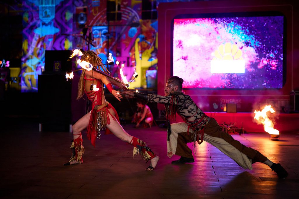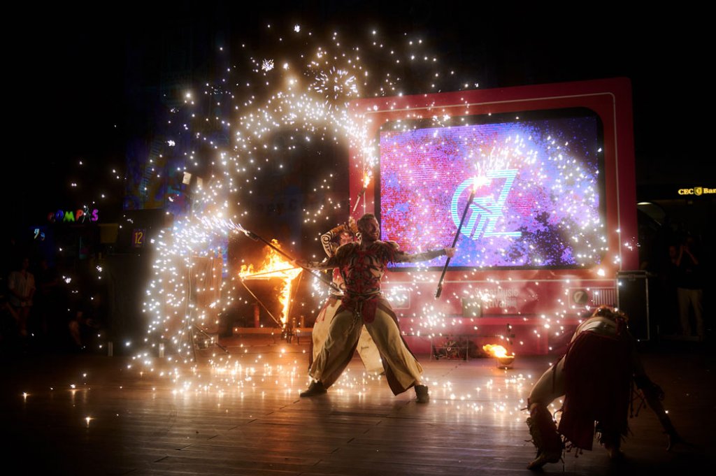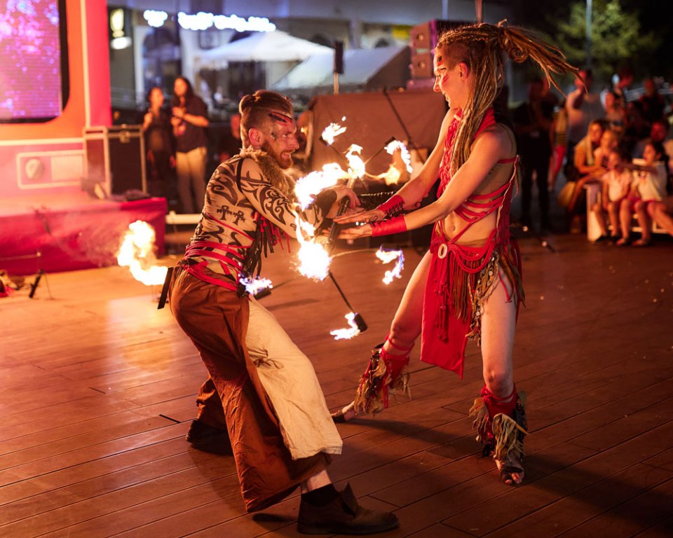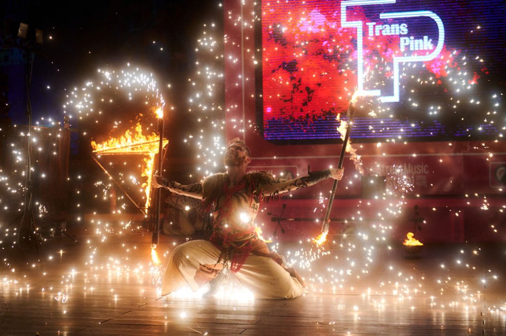 For the festival, we chose the tribal drum show, which we enhanced with ground flamethrowers and fire decorations. An interesting feature was the changing of stages. We performed at three locations in one day with little time to relocate. Good coordination between the performers and the technical team was necessary to make everything work as planned.