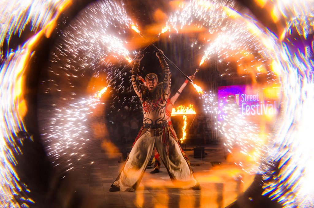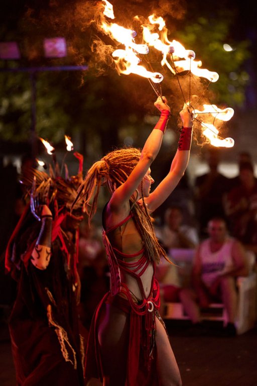 At the Street Art Festival in Satu Mare in Romania, we performed a Tribal Fire Show with flamethrowers and a good dose of pyrotechnics. It was an incredible experience for us. The people in the audience were fantastic, and we won second place in the festival competition.