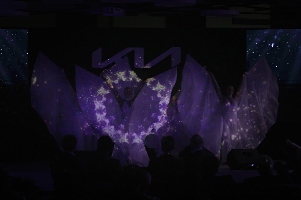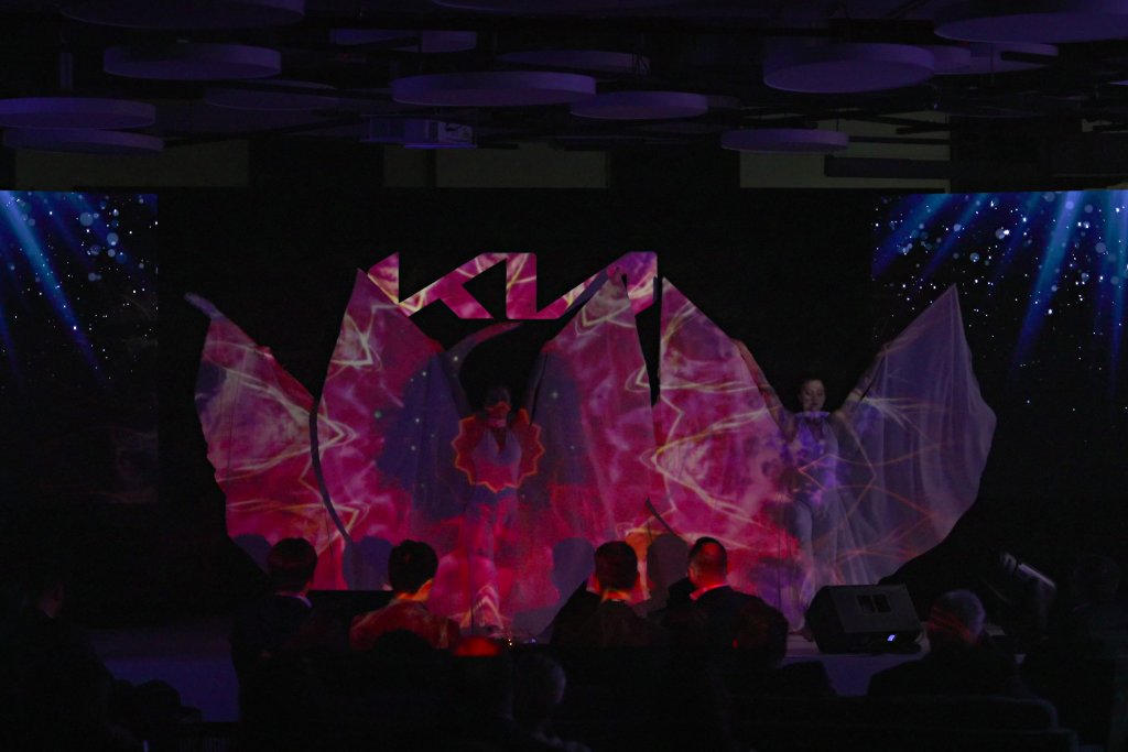 A combination of projections on the performers' costumes and LED screen, precise partner acrobatics, a light show featuring logo and LED costumes, and quality dancing.