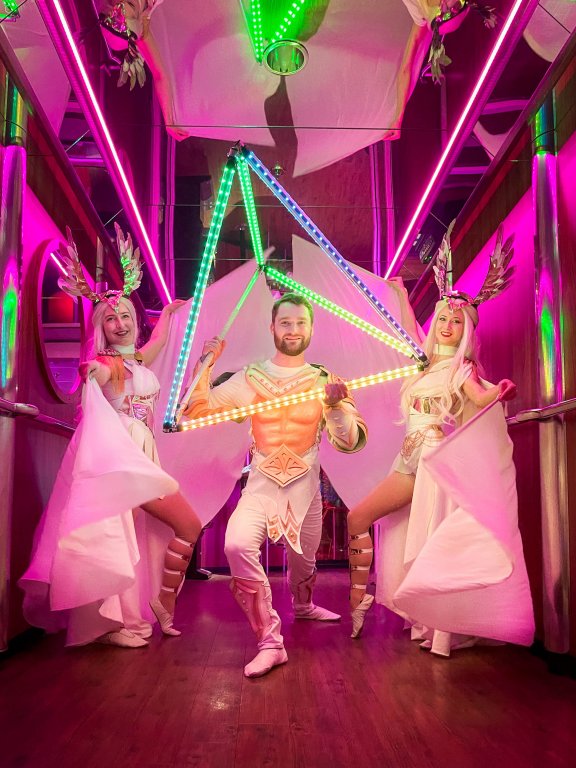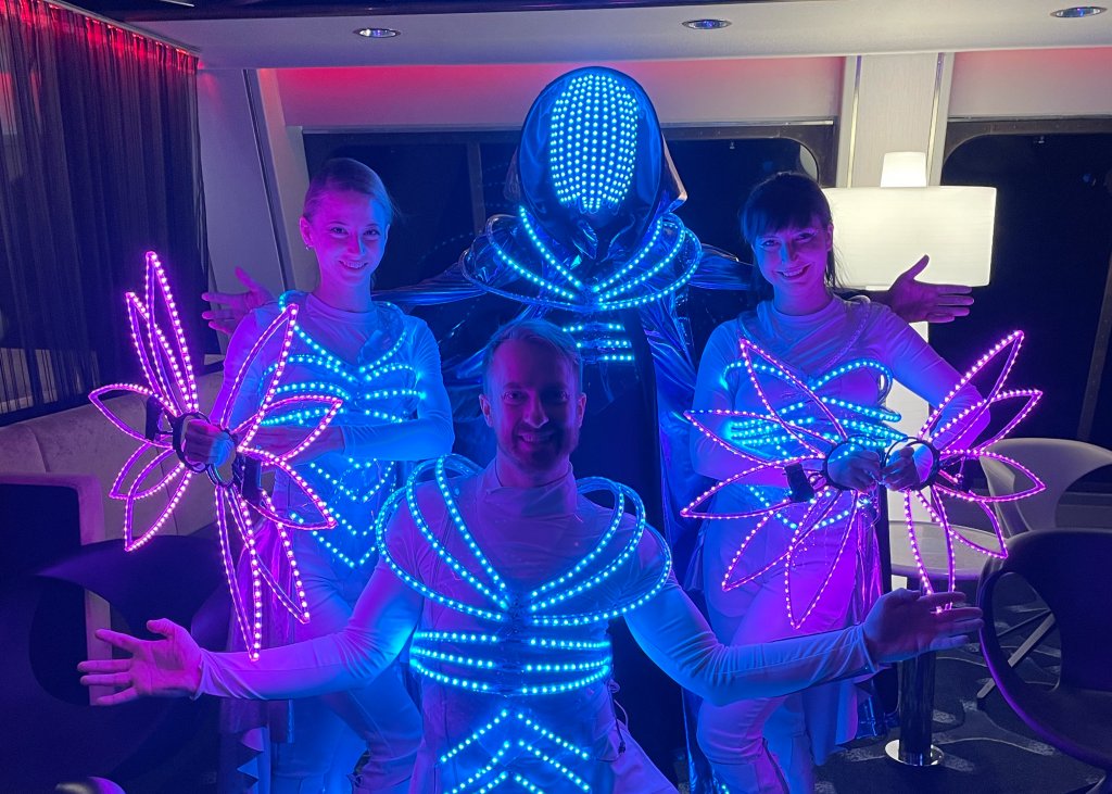 For five weeks, cruise ships Gabriella and Amorella became a temporary home for two 4-member teams. The entertainers performed two kinds of light shows, including video projections. The whole program was complemented by walking acts during the evening.