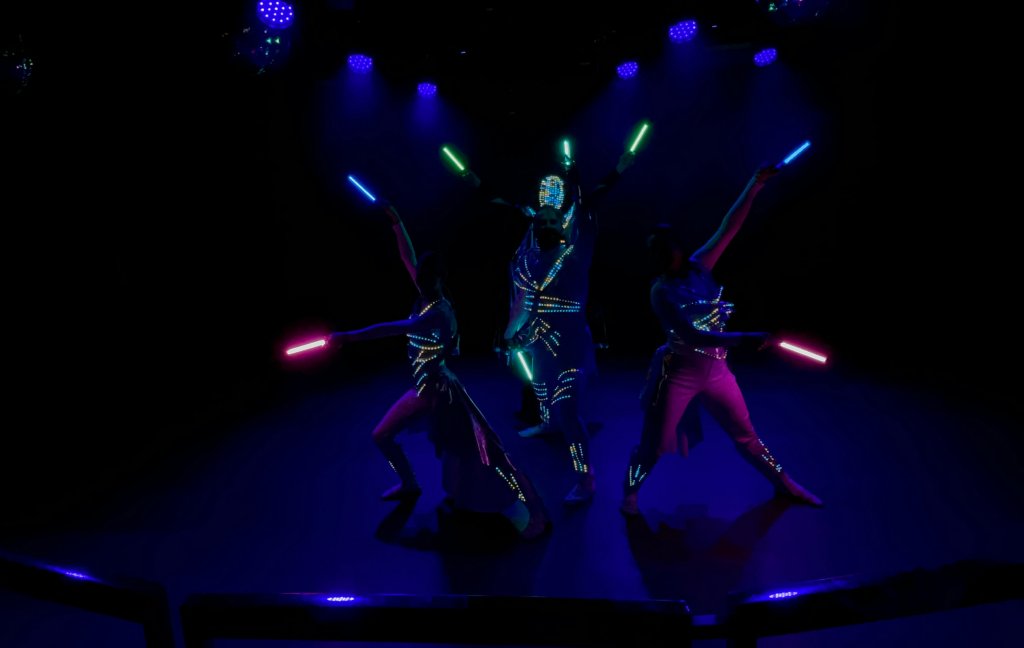 Five weeks, two teams, and a total of 40 light shows. We performed our Light Show with LED costumes and LED Show with Projections, with customized projections mapped onto a UV backdrop.