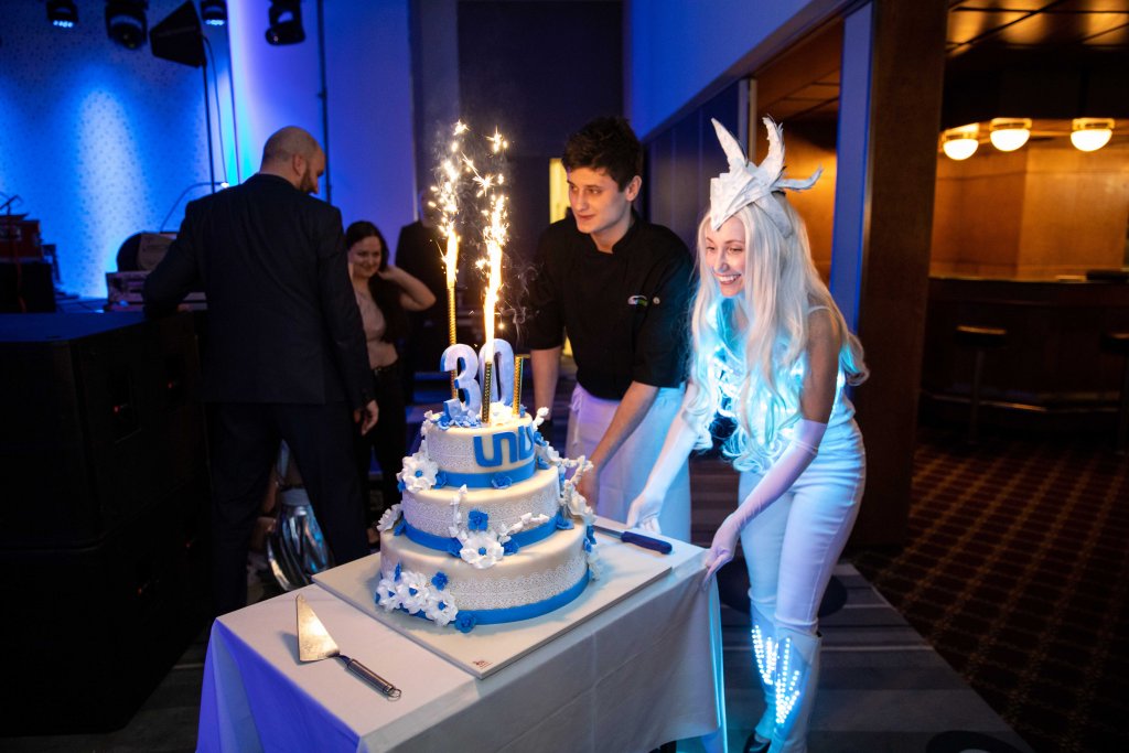 Unis celebrated its 30th anniversary. This Brno-based company entrusted us with a crucial part of its program. We prepared a tailor-made light show with projections on artists' costumes, Special LED Hostesses with illuminated welcome drink tables, Programmable LED Vases, a UV show, and an Interactive Photo Booth.