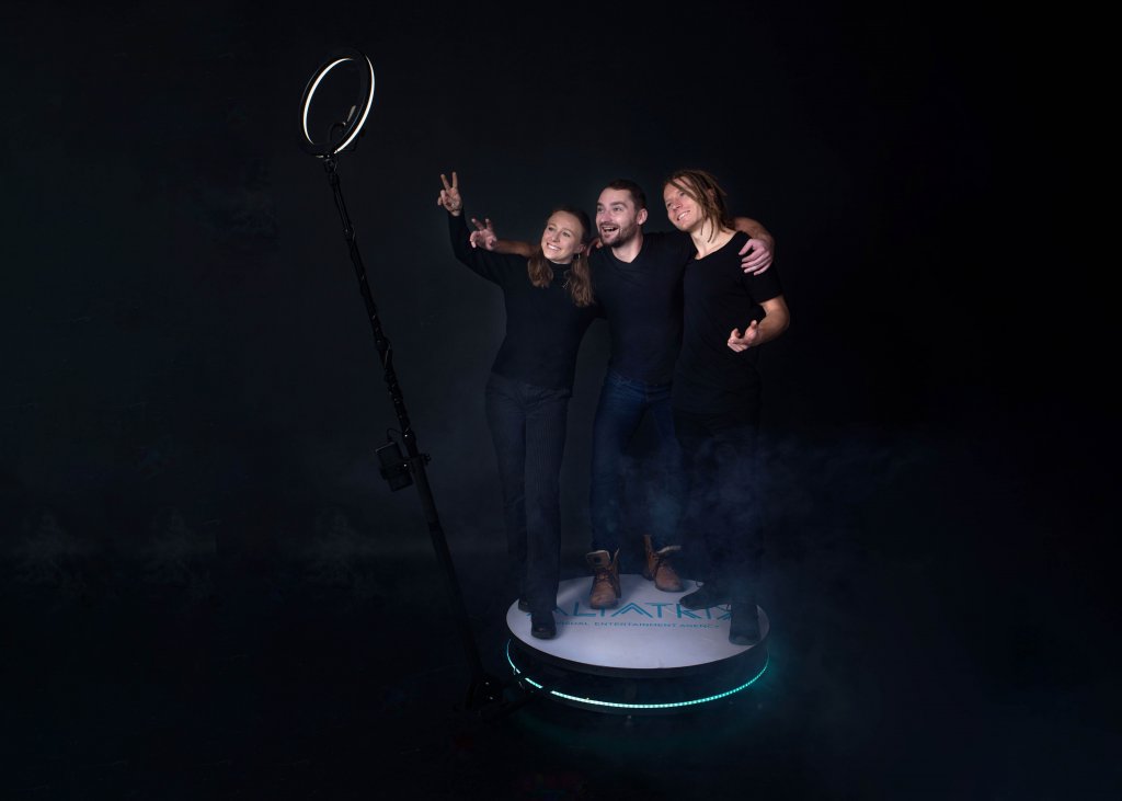 360° video point with a backlit platform for up to 4 people records a short video in few moments, so you can create an unforgettable memory of the event in motion. We will send the video to your email, WhatsApp, via AirDrop or SMS, or generate a QR code.