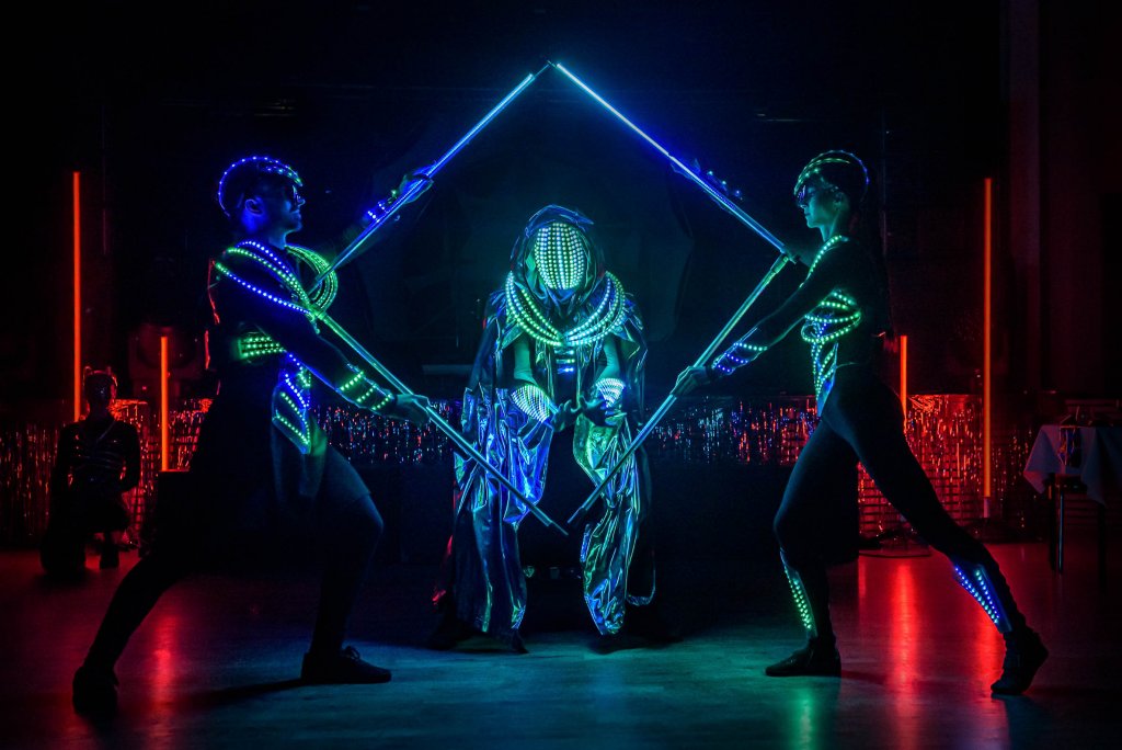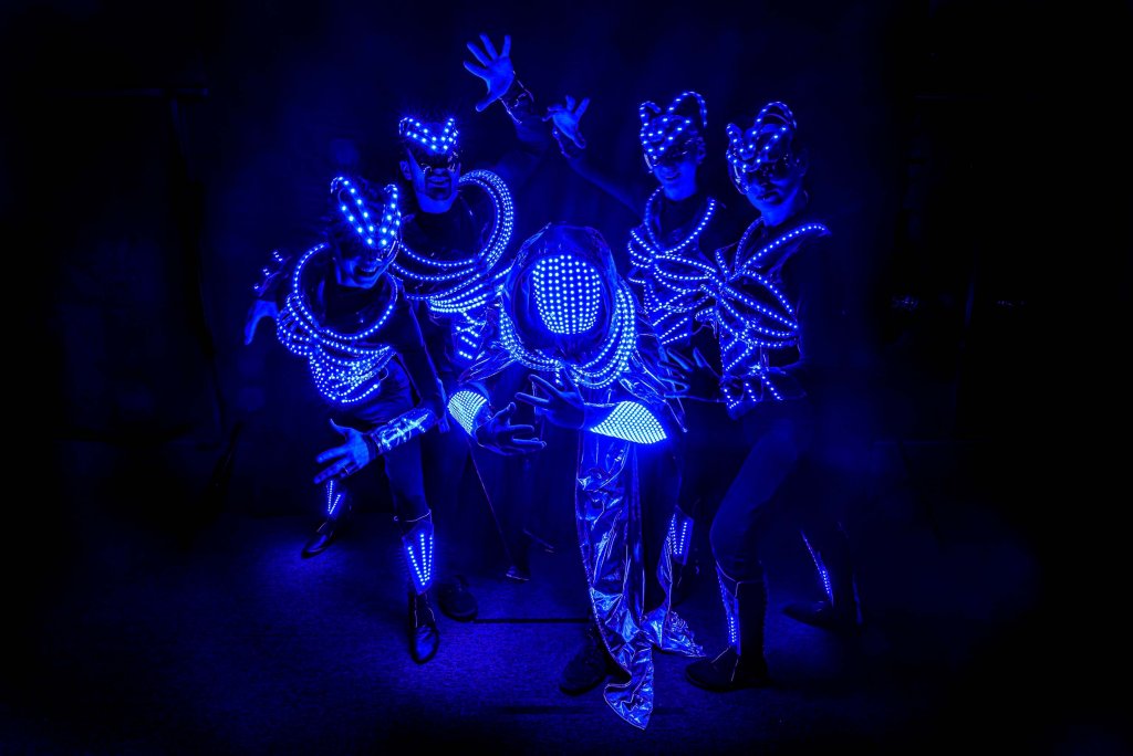 The dominant figure of the performance is a dancer in a full-face LED mask who controls all the performers on stage. The latest programmable LED technology, elaborate original light costumes and dynamic music give the performance a futuristic style.