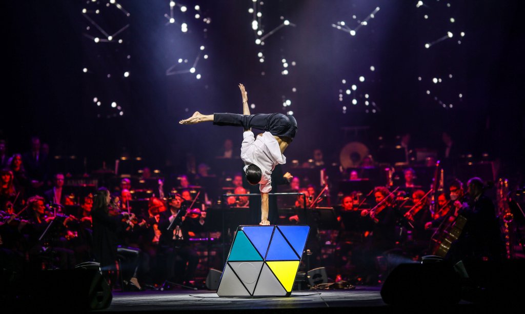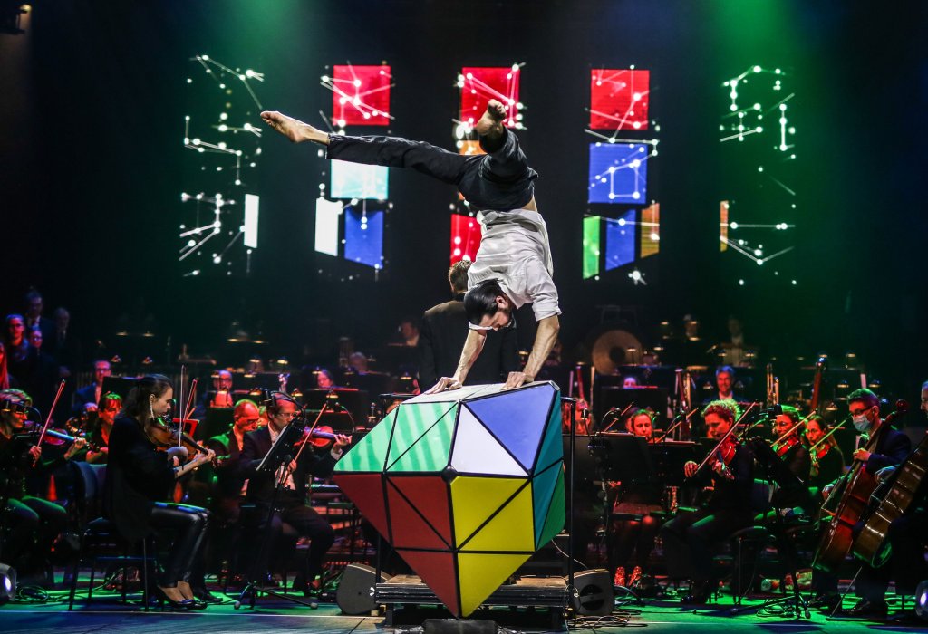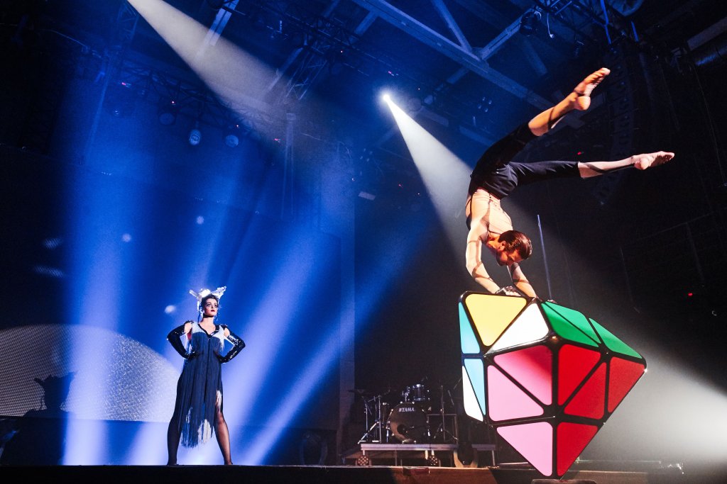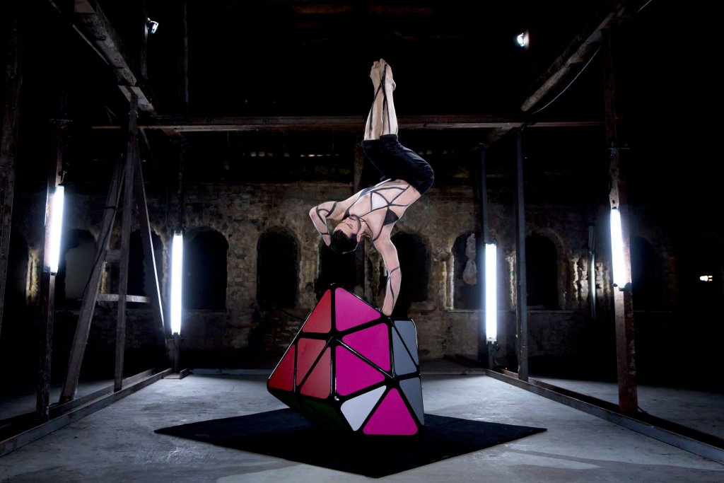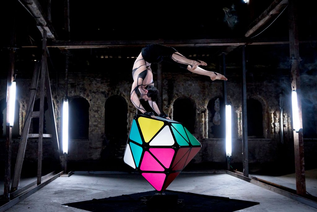 The act "Rubik's cube" is a constant acrobatic interaction between the performer and a special prop, which forms an intricate mechanism. The precision and rigor of the geometric lines of this mechanism become complex thanks to the perfect movements of the artist's body in a performance that will entertain you.